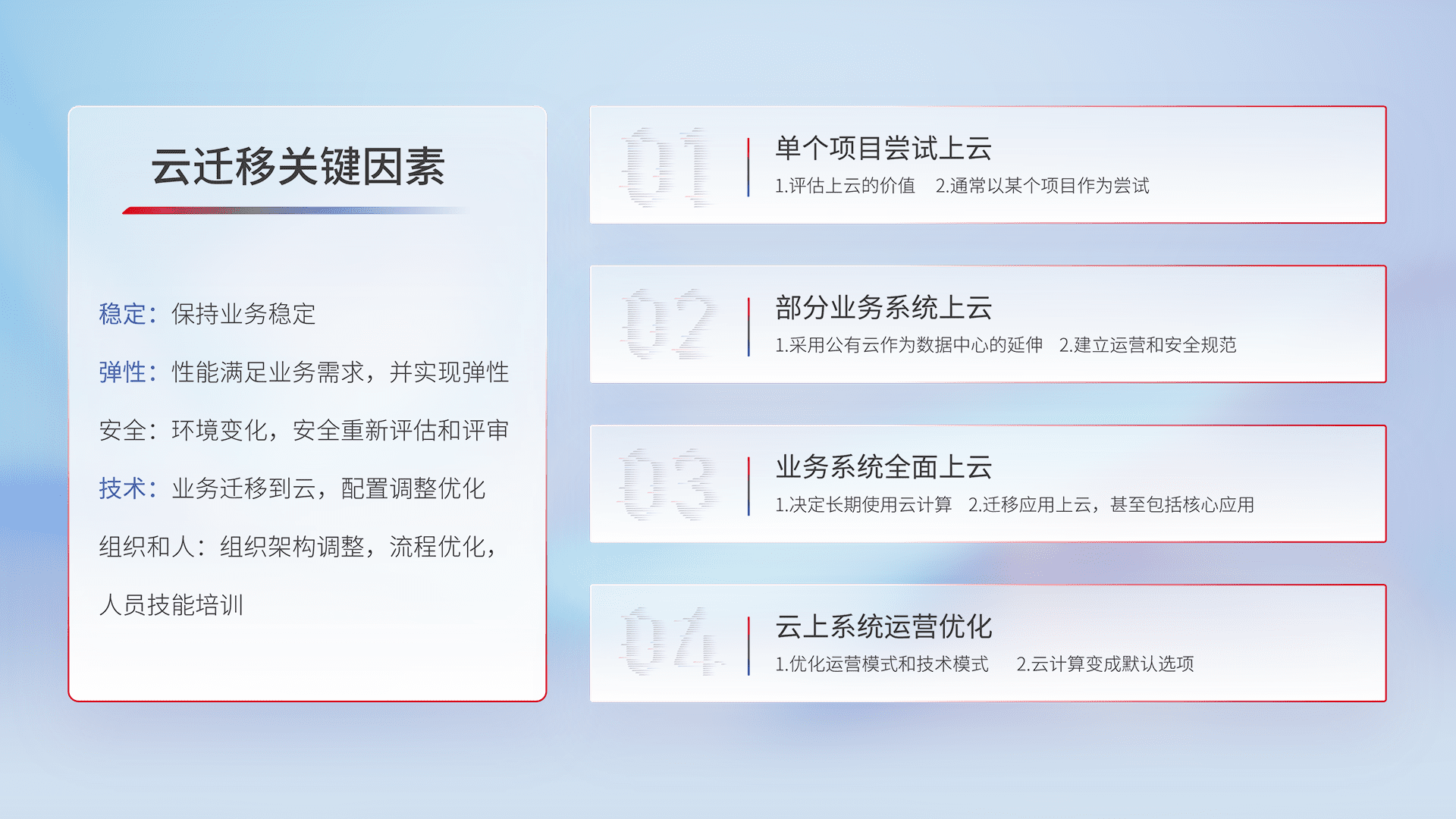 结合实际业务,,,,从规划设计、、云平台选型、、、云原生改造、、数据迁移、、、、集成交付,,,迁移全过程为客户识别最佳上云路径,,,,做好风险识别管理,,,设计网络架构、、身份权限、、、安全审计合规、、操作审计、、日志审计、、、、监控告警策略、、、多站点容灾设计等,,对云上基础设施进行整体规划,,,,提升IT治理水平,,以满足弹性、、高可用、、高性能的需求。。