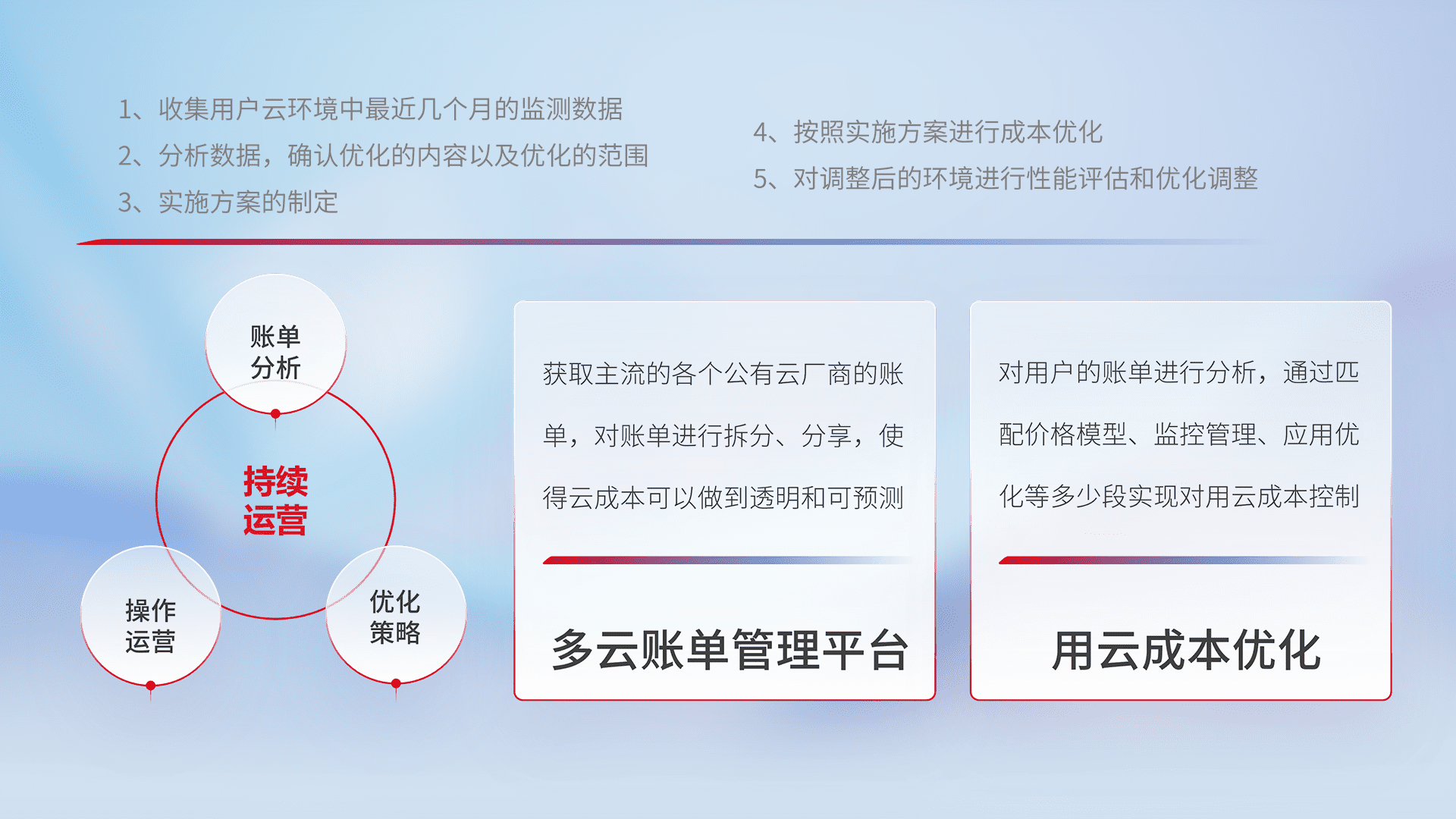 通过多云纳管,,以统一的资源数据模型把客户的云资源进行抽象和封装,,进而实现对多云资源的统一操作,,保障云资源管理的可靠性、、、稳定性与可用性。。。量身定制化运维内容,,,,配置、、、、开发运维、、、补丁管理、、、备份、、监控、、、认证和访问管理、、、审计和日常巡检等,,保障在用云过程中的可靠度,,,稳定度以及高可用率。。。